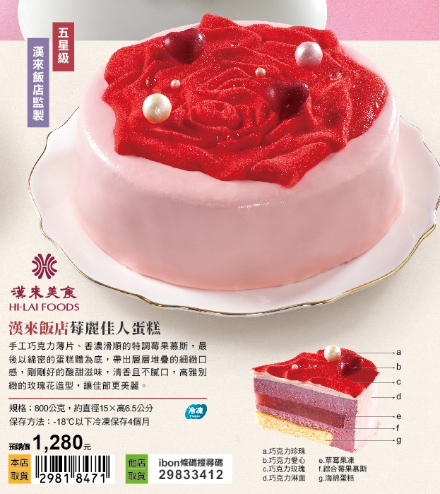 五星級漢來飯店監製,薄巧克力、厚厚莓果慕斯及特調果醬雙層次,以綿密蛋糕體為底,帶來細緻堆疊的層次口感和剛剛好的酸甜不膩,還有精心的花朵設計,讓佳節更美麗。