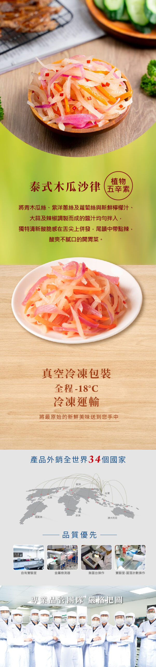 將青木瓜絲、洋蔥絲及紅蘿蔔、白蘿蔔絲與新鮮檸檬汁、大蒜及辣椒調製而成的醬汁均勻拌入,獨特清新酸脆感在舌尖上併發,尾韻中帶點辣,酸爽不膩口的開胃菜。