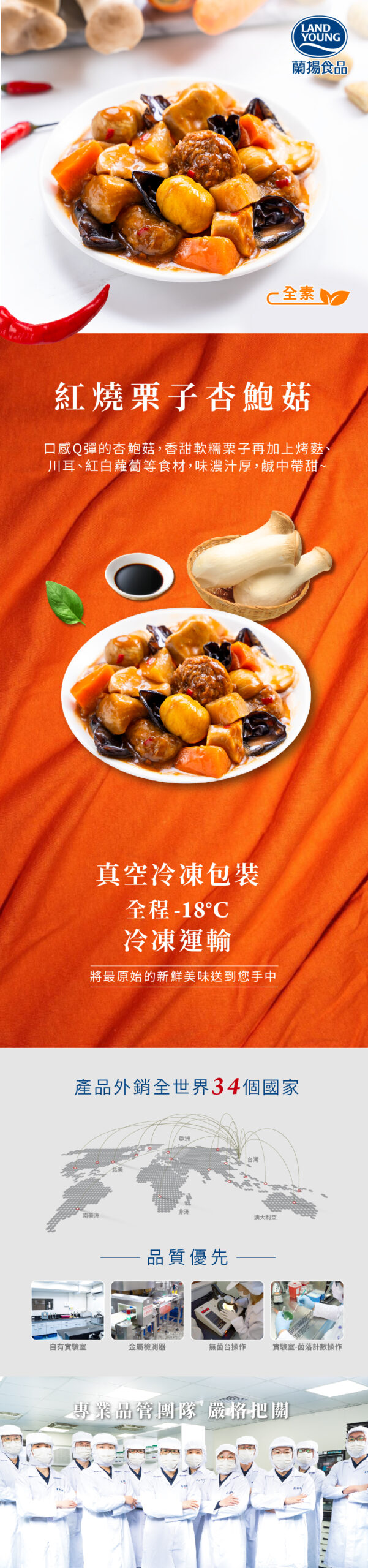 選用口感Q彈質地細緻的杏鮑菇入菜,搭配粒粒飽滿香甜軟糯的栗子,再佐以軟嫩的烤麩及脆口的木耳和紅蘿蔔、白蘿蔔,以醬油及冰糖小火燉煮,再加入八角、甘草等辛香料一同燉煮,最後點綴少許精選辣椒油,使所有食材都裹上透亮的紅褐色外衣,味濃汁厚,鹹中帶甜,層次豐富不膩口,鹹甜微辣的好滋味大人小孩都愛吃。