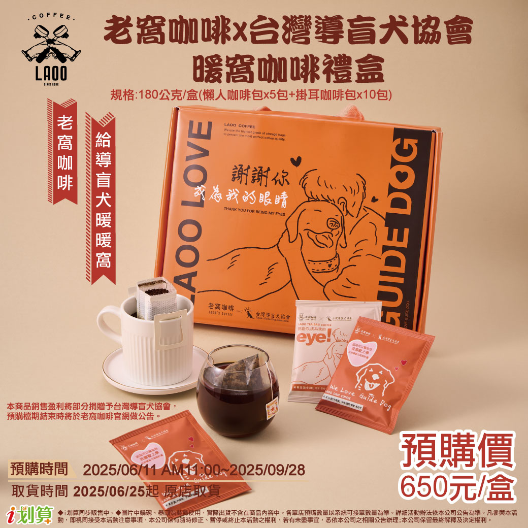 懶人咖啡包與掛耳咖啡包為禮盒,每銷售1盒,贈於協會20元,作為導盲犬基金,大家送禮同時也可以獻出小小的愛心。