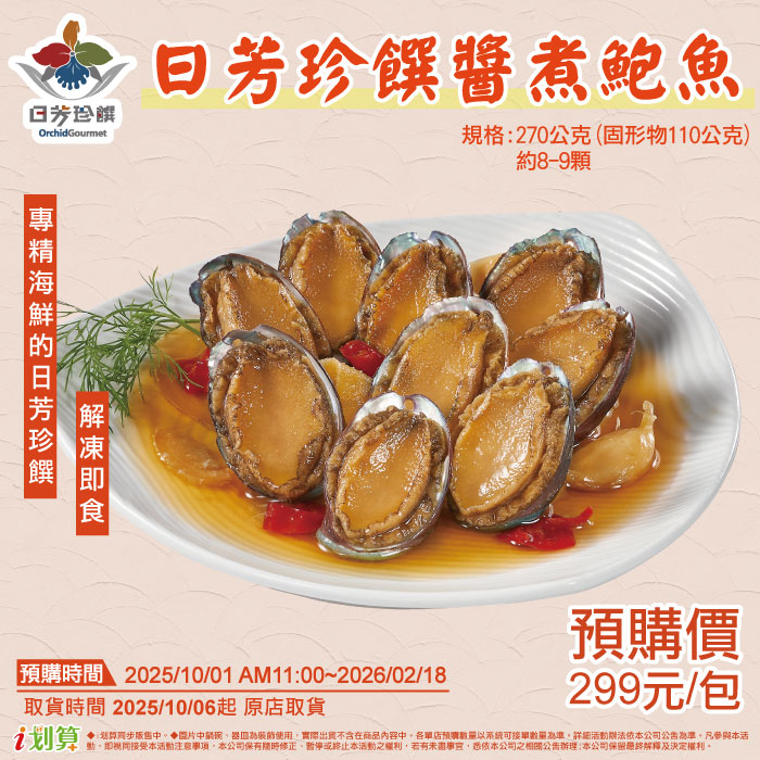 帶殼鮑魚以日式醬燒煮,甘甜微鹹的醬汁加入整顆完整蒜頭調味,鮑魚飽滿味甘鮮美,解凍即食,輕鬆享受美食!