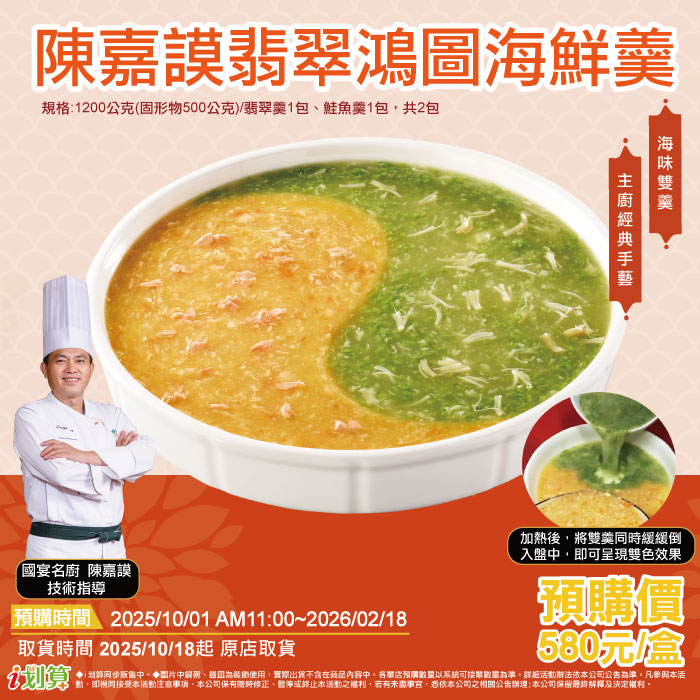 | 【商品成分】 | 翡翠羹(水、波菜、蛋白、干貝絲、玉米澱粉、大豆沙拉油、馬鈴薯澱粉、雞粉(鹽、麥芽糊精、L-麩酸鈉、糖、玉米澱粉、香料、雞肉粉、雞油、酵母萃取物、棕櫚油、硬質棕櫚油、5’-次黃嘌呤核苷磷酸二鈉、5’-鳥嘌呤核苷磷酸二鈉、白胡椒)、紹興酒(糯米、蓬萊米、小麥)、香油(芝麻油、大豆油)、糖、味精、白胡椒粉。 鮭魚羹(水、紅蘿蔔、鮭魚、蛋白、蟹黃(紅蘿蔔、蝦米、洋蔥、鹹蛋黃、蟹肉、大豆沙拉油、鹽、L-麩酸鈉、糖、蛤蜊精粉(糊精蛤肉抽出物、鹽、琥珀酸、反丁烯酸)、魚粉(L-麩酸鈉、乳糖、糖、葡萄糖、酵母粉、琥珀酸鈉、蛤蠣萃取物、食用色素5號)、干貝絲、馬鈴薯澱粉、雞粉(鹽、麥芽糊精、L-麩酸鈉、糖、玉米澱粉、香料、雞肉粉、雞油、酵母萃取物、棕櫚油、硬質棕櫚油、5’-次黃嘌呤核苷磷酸二鈉、5’-鳥嘌呤核苷磷酸二鈉、白胡椒)、紹興酒(糯米、蓬萊米、小麥)、香油(芝麻油、大豆油)、糖、味精、白胡椒粉) |