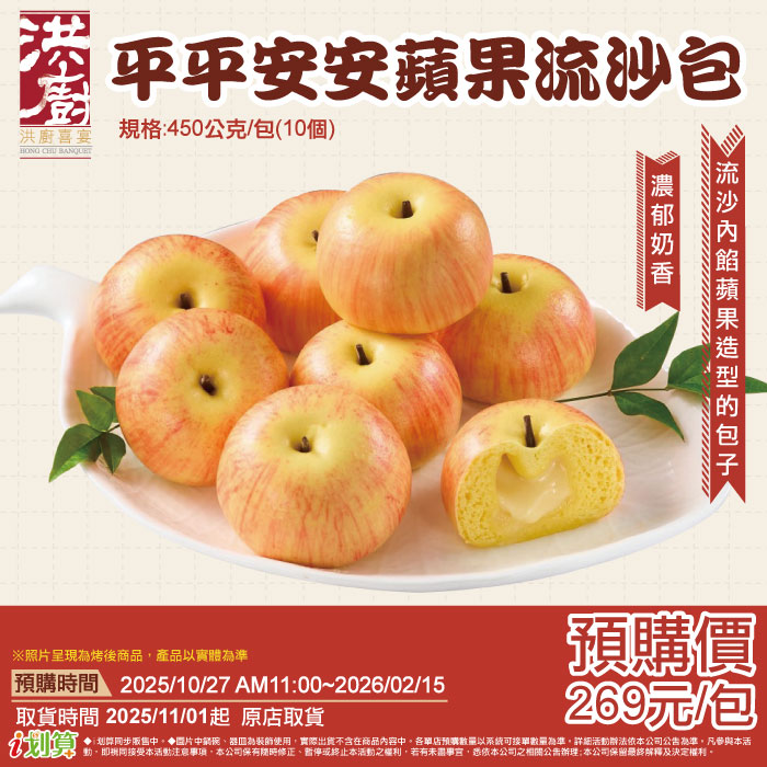 宴席後的討喜甜點,象徵新年平平安安的意象!蘋果造型的流沙內餡,濃郁奶香,加熱即食・輕鬆上桌,平時當早餐、點心首選。